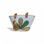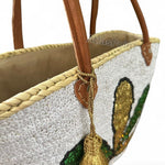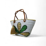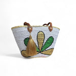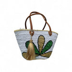 Handmade Sequin Leaf Straw Basket with Leather Handles โ Boho Chic Tote for Summer, Market & Beach